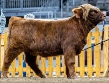 "The broad side of the barn" walking. This shy but sweet brindle could not be any more square in all directions if she tried and makes a beautiful argument as to how a Highland breeder might have excellent beef production from a heritage Highland without compromising standards. Cherry Lu has a beautiful udder and some of the thickest, prettiest horns to match her thick…well, everything. Her first heifer calf is a carbon copy of her in every way, and that baby is stuck to her mama for all the love and patience Cherry Lu gives.
